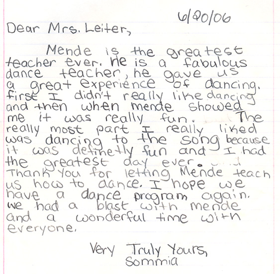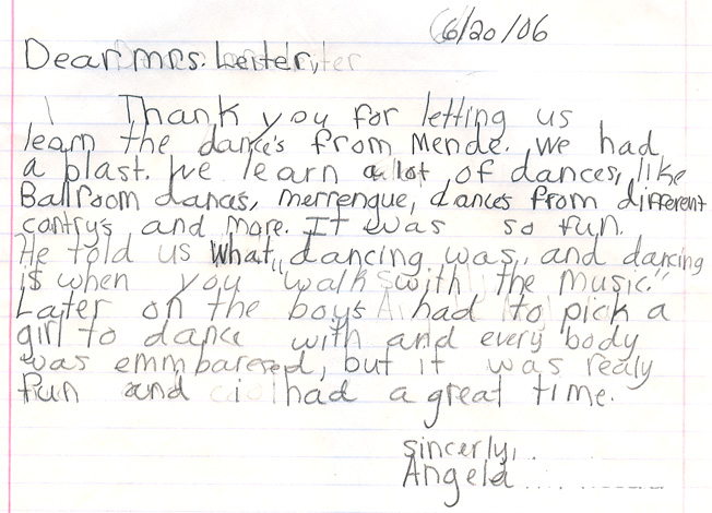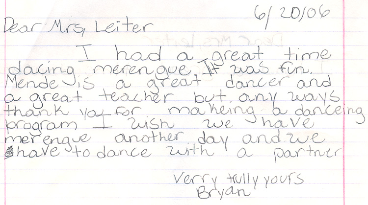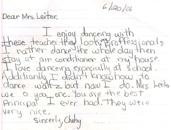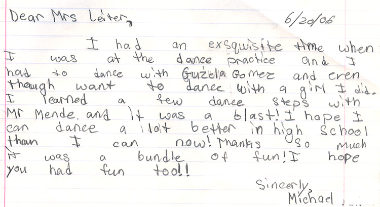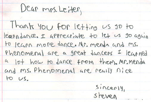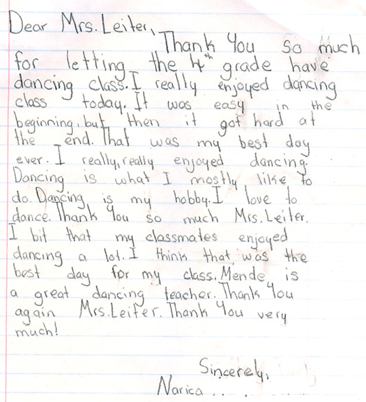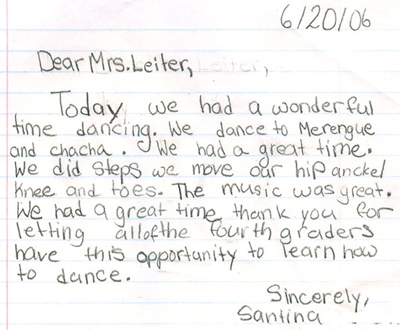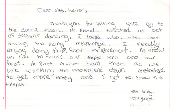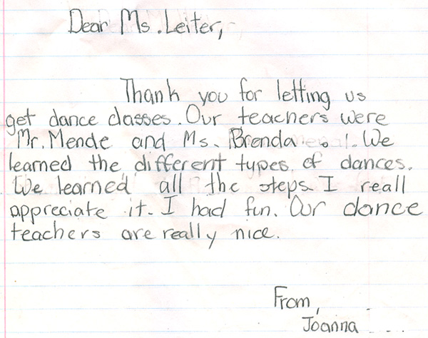 Our teachers have had the pleasure of teaching dance programs at many schools, from day cares and pre schools, to high schools and colleges, and everyone in between. We've even had the pleasure of hosting field trips in our ballroom! We feel that dancing is an excellent skill that can be used throughout a lifetime, and take great joy and pride in opening youngsters eyes to this fun, physical art form. Below are pictures and letters from some of our past, and present students.